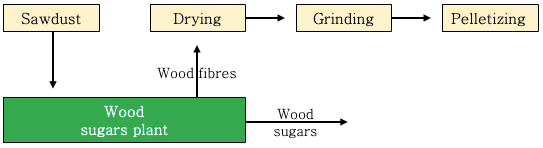 The pellets made from the wood fibres after extraction of wood sugar are of a better quality than ordinary wood pellets. In addition, the drying costs are much lower, because the moisture of the wood fibres will be much lower than in the sawdust. More information here.